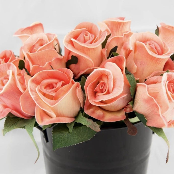 Warm and romantic, the Peach Rose Bouquet features beautifully crafted rose blooms in soft peach tones, paired with realistic green foliage for a fresh, natural look. Each rose is intricately detailed with velvety petals and gentle color gradients, capturing the charm of fresh-cut flowers. Ideal for weddings, home décor, or gifting, this bouquet adds a touch of elegance and warmth to any setting.