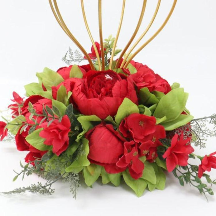 Vibrant and bold, this Red Floral Centrepiece features a stunning arrangement of rich red blooms, including lifelike peonies and petite blossoms, nestled among soft green foliage and delicate fern-like accents. The vivid red petals create a dramatic contrast against the lush greenery, offering an eye-catching focal point for any table or decorative setting. Finished with a gold wire frame detail rising from the centre, it adds a modern, elegant touch. Perfect for weddings, events, or home décor, this maintenance-free piece brings lasting beauty and sophistication to any space.