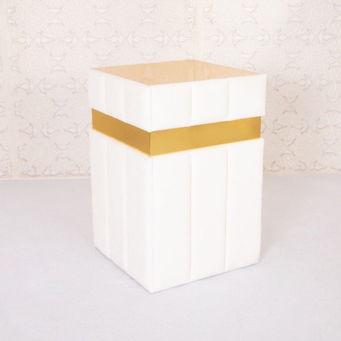 Elevate your event or interior decor with this stunning Luxury White Pedestal Stand. Designed with elegance in mind, this rectangular pedestal features a sleek white panelled exterior, highlighted by a striking gold metallic band for a touch of sophistication. The glossy top surface adds a refined finish, perfect for displaying floral arrangements, sculptures, cakes, or decorative pieces.