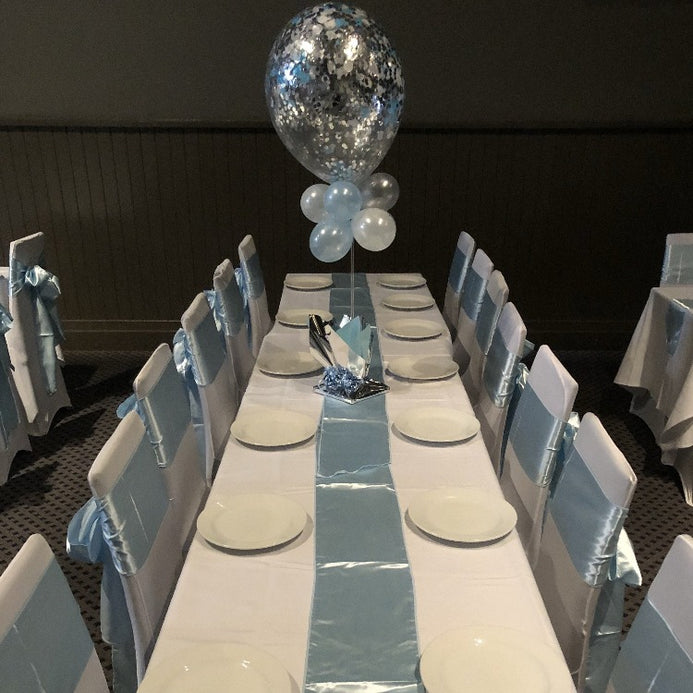 Dress up your chairs and add some soft, cool tones to your venue with these beautiful satin sashes. Best suited for christenings and birthdays. Matching napkins and tablecloths are available